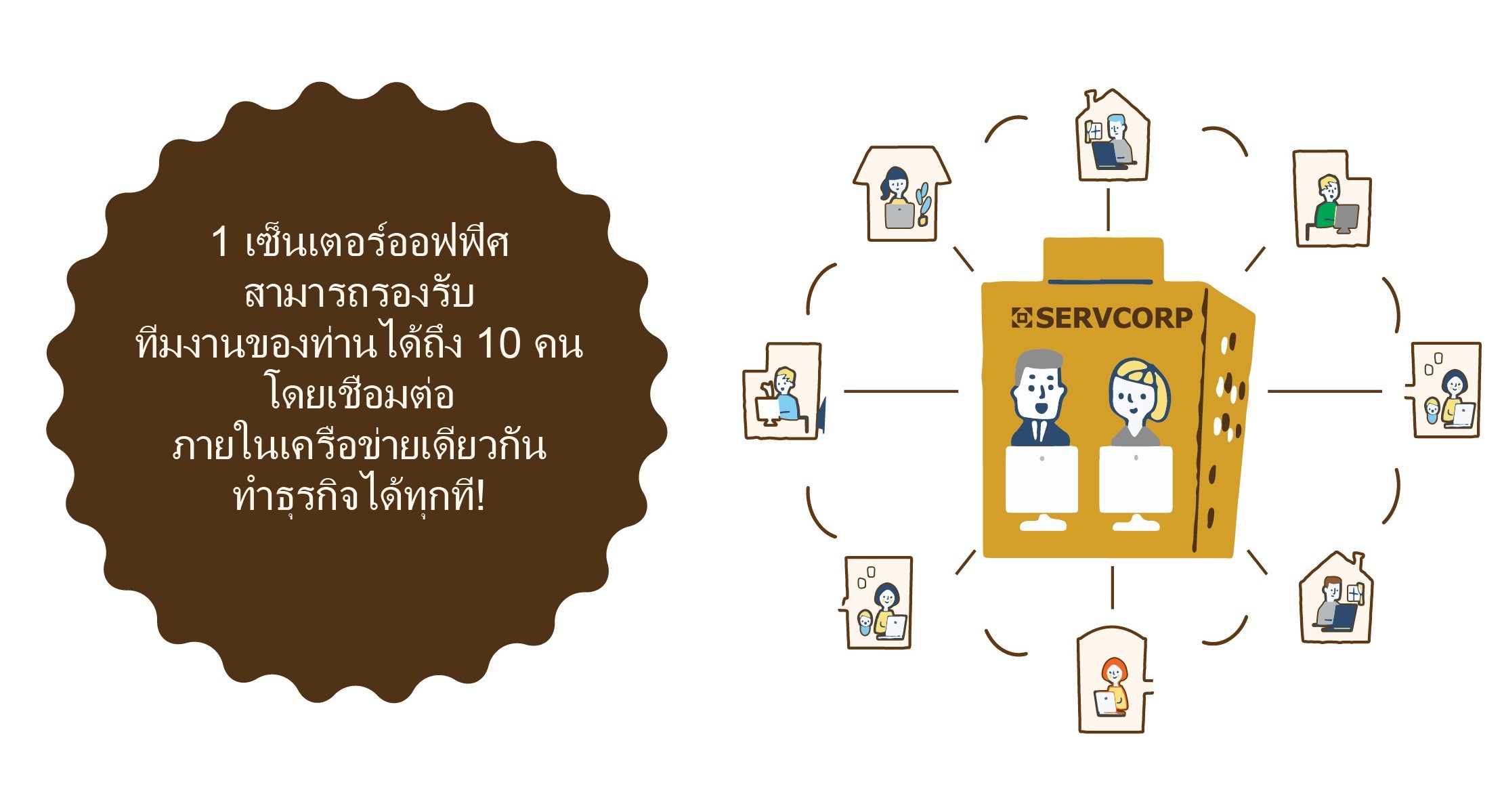 โซลูชันด้านไอทีของเซอร์ฟคอร์ป ช่วยให้คุณสามารถดำเนินธุรกิจด้วยออฟฟิศที่มีความเป็นส่วนตัว โดยพนักงานสามารถทำงานได้จากที่บ้านหรือที่ออฟฟิศของเซอร์ฟคอร์ปถึง 10 คน สมัครใช้บริการสำนักงานครบวงจรและเพิ่มแพ็คเกจสำหรับทีมที่ทำงานนอกสถานที่ เพื่อให้ทีมของคุณมีความยืดหยุ่นในการใช้พื้นที่ทำงานร่วมกันของเซอร์ฟคอร์ป โซลูชันการทำงานระยะไกลของเซอร์ฟคอร์ปจะช่วยให้มั่นใจได้ว่า ทีมของคุณจะประสบความสำเร็จ และจะช่วยประหยัดค่าใช้จ่ายในการเช่าสำนักงาน